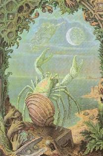 La locomotion rétrograde du crabe illustre la propension du Cancer à se perdre lui-même avec joie dans le passé. Il vit dans un état de conscience historique et, rétrospectivement, il peut apprécier la continuité des événements. D'où la représentation du signe dans l'ancienne Amérique sous la forme du «serpent à plumes qui se déplace à reculons». Pour les Chinois c'était la coupe transversale d'un arbre dont les cercles annuels racontent l'histoire. Je les ai tous inclus dans le cadre du tableau.
