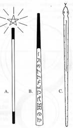 Le modèle B nous montre une baguette qui est dite avoir été utilisée par Salomon, le Roi des Israélites, et sur laquelle sont inscrites en langages célestes les noms et paroles sacrés. Ce dessin est tiré des "Clefs de Salomon, le Roi", un manuscrit rare du British Museum. Il comporte le même symbolisme que le premier, représentant un tube creux à travers duquel jouent les forces de vie en un courant ascendant et descendant.