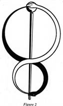 Dans la figure 2 nous voyons deux serpents, un noir et un blanc, qui étaient utilisés par les anciens pour symboliser ce double usage du pouvoir spirituel. Ce qui tend, à notre stade d'évolution, à attirer ces pouvoirs vers le bas à travers l'égoïsme est sur le sentier du serpent noir, alors que les caractéristiques à l'intérieur de nous-mêmes dans lesquelles l'altruisme prédomine élèvent les pouvoirs de l'esprit vers le haut à travers le serpent blanc et libèrent finalement la conscience spirituelle.