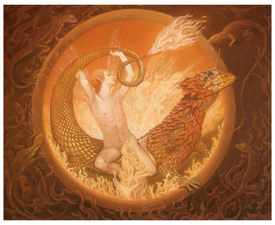 son vêtement de flammes" Max Heindel.C’est en méditant ces quelques lignes de Max Heindel que nous serons mieux en mesure de prendre conscience de la Nature et de l’action des Esprits du feu, dernière des quatre classes d’élémentaires que nous étudierons. En effet, les Salamandres (ou Vulcani, comme préférait les appeler Paracelse), sont peu intéressées à l’humanité et les renseignements que nous possédons à leur sujet sont par conséquent rares et incomplets. La tradition nous dit que leur roi s’appelle Djin et que leur royaume "est au sud". Au Moyen Âge, on représentait souvent les Salamandres sous forme de lézards plus ou moins fantastiques qui faisaient alors fréquemment partie des armoiries familiales. Il arrivait aussi que les sculpteurs gravent leurs représentations symboliques sur les cheminées ; elles jouaient alors dans l’imagerie populaire le même rôle que les dieux lares de la Rome Antique. Comme nous avons pu le remarquer dans l’article précédent, les habitants des deux éthers supérieurs (et pour les raisons que nous avons déjà énumérées) n’ont que peu de rapports avec l’humanité ordinaire. Il ne faudrait toutefois pas conclure que leur influence est sans effet sur notre existence ou celle de tout ce qui nous entoure, car rien dans la Nature n’est toléré sans raison. Avant de nous pencher sur cette question, citons d’abord un court texte de l’abbé Villars, écrit au XVIIIème siècle, et qui nous indique sous forme imagée comment prendre contact avec les Esprits du feu. "Si l’on veut recouvrer l’empire sur les Salamandres, il faut purifier et exalter l’élément du feu qui est en nous et relever le ton de cette corde relâchée. Il n’y a qu’à concentrer le feu du monde par des miroirs concaves dans un globe de verre ; et c’est ici l’artifice que tous les Anciens ont caché religieusement et que le divin Théophraste a découvert. Il se forme dans ce globe une poudre solaire, laquelle s’étant purifiée d’elle-même du mélange des autres éléments et étant préparée selon l’art, devient en fort peu de temps souverainement propre à exalter le feu qui est en nous et à nous faire devenir, par manière de dire, de nature ignée. Dès lors, les habitants de la sphère du feu deviennent nos inférieurs (….)". Beaucoup de choses ont été dites sur l’auteur de ces lignes. Pour certains, c’était un fumiste ; pour d’autres, un impie qui aurait révélé impunément les mystères des sectes occultes, ce qui aurait entraîné son assassinat en 1675. Il ne nous appartient pas de porter un jugement en ces matières et c’est pourquoi nous laissons le lecteur estimer par lui-même l’importance de ce qu’il vient de lire. L’Ether Réflecteur Le corps des Salamandres est constitué des parties les plus subtiles de l’Ether Réflecteur. Celui-ci mérite son nom pour plus d’une raison, mais la principale est encore que les images qui y sont consignées ne sont que la réflexion de la véritable mémoire de la Nature qui elle est située dans le Monde de la Pensée. L’Ether Réflecteur est le médium au travers duquel la pensée agit sur le cerveau de l’Homme ; il est en effet en relation étroite avec la quatrième subdivision du Monde de la Pensée, qui est la plus élevées des quatre subdivisions de la Région de la Pensée Concrète, demeure de l’Intellect Humain. C’est là que se trouvent les clichés de la véritable Mémoire de la Nature dont l’Ether Réflecteur ne présente que des images réfléchies. Cet éther ouvre de plus, les voies d’accès de la mémoire. Comme l’Ether Lumière, il est quelque peu atténué chez l’individu moyen et n’a pas de forme définie ; le meilleur qualificatif qui puisse lui être donné est celui d’hyper éthérique. Il s’agit d’une substance bleutée, semblable au cœur de la flamme de gaz ; elle est transparente et semble laisser voir tout ce qu’elle contient. Pourtant, elle recèle tous les secrets de la Nature et du genre humain. Les atomes qui la composent, tout comme ceux de l’Ether Lumière et contrairement à ceux des deux éthers inférieurs, sont volatiles et migrateurs. La quantité d’éthers supérieurs en possession de l’Homme représente pour lui une chose acquise, fruit des expériences qu’il a vécues. Ils constituent en fait une substance qui se mêle à l’intérieur du corps au courant sanguin. "Quand, à force de service et de sacrifice, nous avons développé à l’école de la vie assez de cette substance pour qu’elle déborde de notre corps physique, elle apparaît à sa périphérie sous des couleurs d’or et d’azur : c’est notre corps de l’âme qui commence à naître" Max Heindel. Apparence Selon Montfaucon de Villars, les Salamandres sont particulièrement belles car "elles sont d’un élément plus pur". Pour Paracelse, elles sont surtout vues sous leur forme ignée : "Elles sont visibles au-dessus des marais, des prairies et des champs, mais ne demeurent pas avec l’Homme". Les clairvoyants en distinguent deux grandes classes : 1. Les petites (que Paracelse appelle Acthnici) : Elles mesurent de 7 à 60 cm de haut. On ne peut pas dire qu’elles possèdent une forme définie ; elles sont plutôt d’apparence "brumeuse". Les plus petites ressemblent à des flammes de chandelles. Il arrive parfois que certaines petites Salamandres empruntent la forme d’insectes ou de lézards. 2. Les grandes (dont la hauteur varie de 1,5 à 4,2 m). Les plus grandes vivent dans les volcans ; on peut dire que leur figure se rapproche assez de la représentation que se font les peintres du visage de Méphisto, bien qu’elles ne donnent pas l’impression d’être mauvaises. Leur forme est peu définie, car elle se fond le plus souvent avec les flammes alors que leur figure apparaît dans la fumée et le feu. Les plus petites se retrouvent surtout dans les incendies de forêt. Dans ce dernier ca