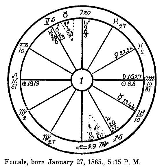 Nous suivrons la progression des planètes à partir du 16 août 1908, année correspondant à la ligne du 12 mars dans l'éphéméride de 1865. En ajoutant à ces positions la distance parcourue par les principales planètes dans leur course pendant cinq mois, nous trouvons qu'en janvier 1909, le Soleil progressé est à 22 degrés 22' des Poissons; la Lune à 27 degrés 28' de la Vierge; Mars à 21 degrés des Gémeaux; Jupiter à 27 degrés 19' du Sagittaire; Vénus à 7 degrés 50' du Taureau; Mercure à 17 degrés 16' des Poissons.