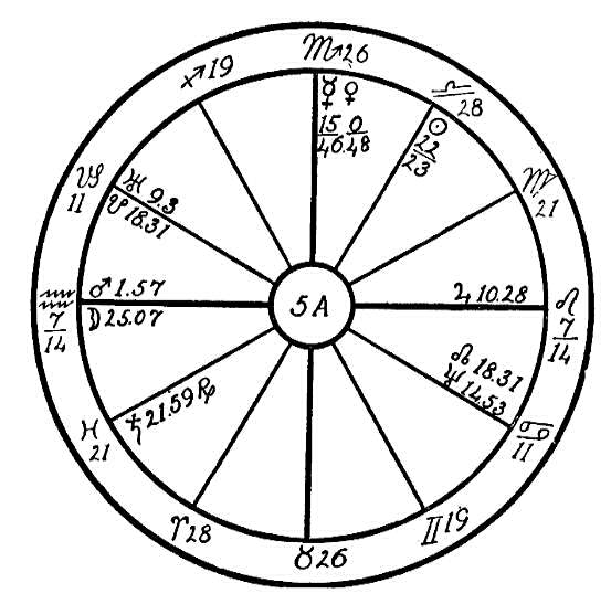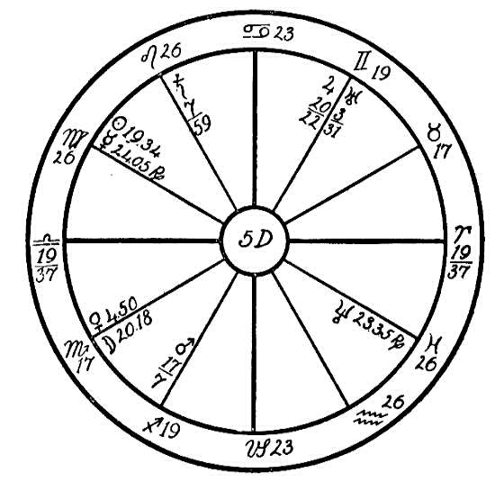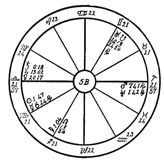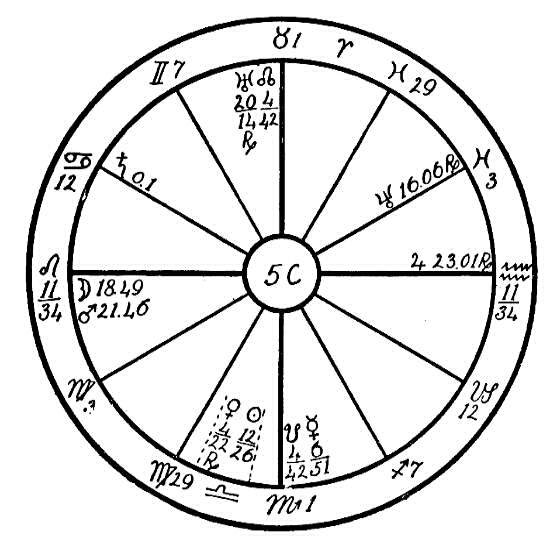 respectivement les circulations artérielle et veineuse. Uranus en sextile à Saturne produit une action spasmodique, ressentie comme des palpitations du coeur. De plus, étant placé dans les Gémeaux, il donne une impulsion spasmodique aux poumons, ce qui provoque chez le malade une respiration difficile, bien qu'il ne puisse s'agir ici d'un état aussi défini que celui des asthmatiques. L'opposition à Neptune du Soleil et de Mercure dans la Vierge indique des troubles intestinaux. Les aspects adverses du Soleil et de Mercure à Jupiter et à Mars dans les maisons des voyages, également l'opposition de Mars à Jupiter montrent une prédisposition aux accidents, spécialement en voyage, mais ces indications sortent du cadre de notre étude.
