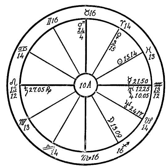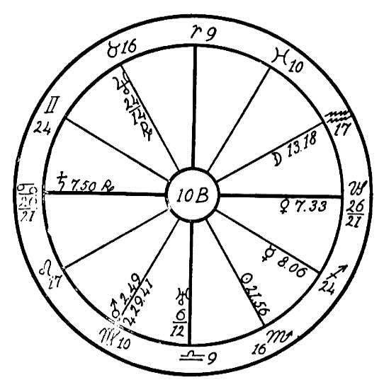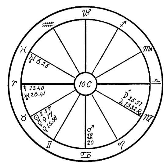 un carré à Mercure et Saturne, dans le Taureau, près de la pointe du milieu du ciel, semblerait présager la mort accidentelle du père. Quand le natif atteignit l'âge de douze ans, la Lune progressée arriva sur le milieu du ciel et en conjonction à Mars; le père fut, en effet, tué par la chute d'un arbre, laissant sans argent la mère et trois jeunes enfants. Ceci obligea l'aîné des garçons, celui dont nous examinons le thème, à travailler pour aider la famille. Il fut placé en qualité d'aide chez un forgeron du voisinage et fut forcé, en pleine croissance à douze ans, d'accomplir le travail d'un homme, maniant la lourde masse sur l'enclume. Il s'ensuivit que les valvules du coeur de l'enfant n'atteignirent pas un développement normal. Il souffrit pendant des années, et chaque fois qu'il réussissait pécuniairement, sa santé s'altérait, et il était obligé d'abandonner son travail et de changer de climat pour obtenir un soulagement. Des médecins pensaient qu'il avait la tuberculose, d'autres de l'asthme. Il avait tous les symptômes d'un asthmatique, mais les crises étaient intermittentes. Chaque hiver, se trouvant dans le climat froid de l'est du pays, il était alité pendant un certain temps avec une pneumonie ou une congestion pulmonaire.