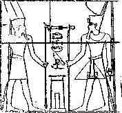 1er BAS-RELIEF: Schwaller de Lubicz montre d'abord le schéma du Temple de Louqsor, en indiquant les emplacements de plusieurs bas-reliefs (A.B.C.D.) et leur relation avec le corps humain, représenté par la projection du pharaon sur ce même schéma. Chacun des bas-reliefs II et III est coupé par un unique joint de pierres horizontal, à des niveaux différents, d'une façon tout à fait déconcertante a première vue. Ce premier bas-relief situé au point A, montre les porte des différentes salles ou parties du temple. L ' auteur fait remarquer la "présence " d'un bas-relief au niveau de chacune de ces portes. La première porte située au point A, est la porte du parvis du Temple: elle correspond à l'emplacement des pieds.Schwaller de Lubicz indique que la 2ème porte, située au point B, est l'entrée du Temple proprement dit et qu'elle correspond aux genoux de l'homme projeté sur le Temple entier. Il est à remarquer que le bas-relief placé au niveau des pieds, annonce la porte suivante située au niveau des genoux. IIème BAS-RELIEF ; De même, le bas-relief n°2 dont le joint de pierres coupe les 2 personnages au niveau du "sexe", annonce la porte suivante au point D.