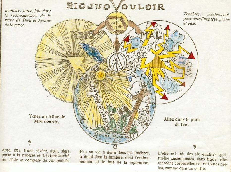 Que voyons-nous sur l'image?trois cercles :celui de droite : allez dans le puits de feu; cela ne vous rappelle-t-il pas quelque chose ce feu? dans le cercle du milieu, on apprend que ce feu ou VIE, est à demi dans les ténèbres; à demi dans la lumière; que nous dit la Bible : " la lumière brille dans les ténèbres, mais les ténèbres ne l'ont point reçue".Cette lumière est VIE; c'est le St Esprit, le Paraclet. C'est Elle qui nous apprend TOUT!Revenons au cercle du milieu; en bas on trouve l'inscription "d'une seule sève"; la sève , la semence, la vie.on y voit deux croix; une noire, une blanche; les Rose-Croix illustrèrent le double rôle et la faculté de la force sexuelle: elle conduit à la grâce ( cercle de gauche: l'inscription : "lumière, force, joie dans la reconnaissance de la vertu de Dieu et hymne de louange", à la conscience divine et à la sérénité ouou dans l'enfer :" l'enfer, à l'atrophie de la conscience de soi, à l'obscurité, à la peur et à la destruction; ( cercle de droite : "ténébres, méchanceté, peur dans l'impiété, péché et vice."Kundalini :