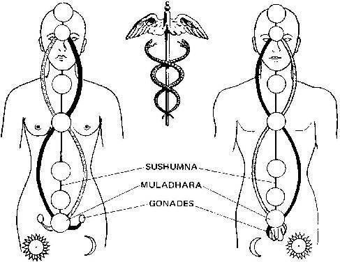 Ida et Pingala; la conjonction du masculin et du féminin dans la tête; les noces alchimiques; le parcours du serpent de la sagesse ( kundalini) par rapport au symbole du Caducée.