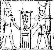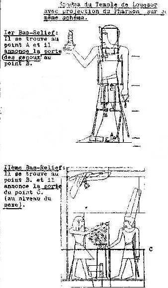 Schwaller de Lubicz montre d'abord le schéma du Temple de Louqsor, en indiquant les emplacements de plusieurs bas-reliefs (A.B.C.D.) et leur relation avec le corps humain, représenté par la projection du pharaon sur ce même schéma.