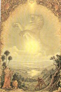 Ce signe toutefois n'est pas exempt d'infirmités: l'égocentrisme du Lion peut en faire la proie de la vanité et de l'ambition, le pousser à tyranniser son entourage. Alors, comme tous les héros solaires de la mythologie, il doit combattre à la fois le lion en lui-même ainsi que d'autres animaux (comme le fit Hercule), placés sur son passage comme des obstacles destinés à être franchis. Ce combat classique figure sur le côté droit au premier plan du paysage. Là, Hercule ou Samson est engagé dans un corps-à-corps mortel avec son propre pouvoir : Léo négatif . S'il en sort vainqueur il deviendra le dieu soleil Apollon qui tient le monde entier sous le charme des sons harmonieux de sa lyre .
