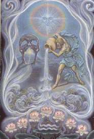 signe. En ce qui concerne le chemin de l'évolution de l'homme à travers le zodiaque, ce onzième signe se caractérise par la transcendance et la fluidité du mouvement à travers toutes les limites. Après avoir gravi la montagne, dans sa phase du Capricorne, pour se renouveler lui-même, l'homme verse les eaux vives d'un discernement neuf, du haut d'une conscience acquise, sur ceux qui sont encore au-dessous, dans la vallée. Il est l'humaniste qui ne se reposera pas avant d'avoir imparti son nouveau savoir aux autres. La limite entre le moi et le non-moi n'est pas respectée ici, loin de là. |
