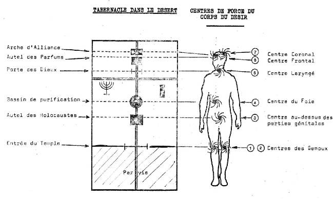 Frères Aînés de la Rose-Croix: Autrefois, le Tabernacle dans le Désert était une tente rectangulaire - Aujourd'hui, le Temple a la forme d'une Croix).Si l'on superpose le schéma dessiné par Max Heindel et le plan du Tabernacle dans le D, on remarque rapidement qu'une fois la "porte des genoux" franchie (tourbillon 1 et 2), l'autel des holocaustes se trouve au niveau du tourbillon suivant (5).