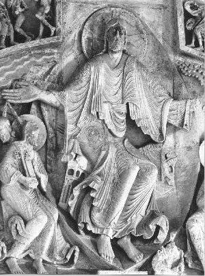 En effet, dans la basilique de VEZELAY, sur le tympan du portail central du narthex, le visiteur peut admirer deux importants tourbillons. (Voir reproduction ci-jointe): Sur le genou gauche du Christ en Gloire, se trouve une spirale négative, alors qu'une autre spirale, positive celle-là, se trouve au niveau du col du fémur,(donc, approximativement au niveau du sexe). A quelques millénaires d'intervalle, l'intention des maîtres d'oeuvre demeure semblable. A VEZELAY, les tourbillons remplacent les joints de pierres...; qu'il s'agisse des uns ou des autres, les GENOUX indiquent toujours l'entrée du Temple. Grâce aux Enseignements transmis par Max Heindel, le symbolisme de ces spirales peut recevoir une explication: Lorsque le candidat franchit la porte du temple (genoux), il peut temporairement, lire dans 1'éther-réflecteur (spirale négative du genou gauche). Mais, pour franchir la porte suivante, le candidat devra travailler afin d'acquérir la clairvoyance positive (spirale positive du col du fémur droit). L'intention du Maître d'oeuvre semble bien vouloir montrer que Christ indique le chemin de l'Initiation chrétienne. |