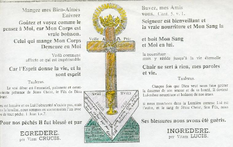 Son âme est l'essentiel dans mon âme, et pour l'amour de cette Ame, Dieu est devenu homme, afin que nous puissions devenir semblables à Dieu en Lui et à travers Lui dans l'amour et la vie de Jésus Christ. Afin que nous puissions renaître et être révélés dans l'image céleste éternelle, dans une vie divine. 0 Homme : C'est un grand Secret insondable quand nous venons à considérer et à nous souvenir que nous sommes les membres d'un seul corps dans le Christ, et que nous ne sommes tous qu'Un en Lui, et que tous, nous recevrons et bénéficierons du Christ Un, et que nous sommes et restons un corps unifié dans le même Christ, lequel corps Il est Lui-même. Et nous sommes le corps et les membres. Oui, nous sommes liés et unis ensemble avec et en Lui à un Homme, et cet Homme est chacun individuellement dans le Christ. Par l'intermédiaire du pain et du vin, nous mangeons et buvons tous le corps et le sang du Christ, avec le désir Essentiel et une bouche qui désire croire, l'amour ardent et la bouche de vie de nos âmes. Le véritable homme intérieur, créature de paradis et d'éternité, image de Dieu, est caché sous une grossière forme animale, et désire un aliment spirituel ou Tinctur et mange donc la chair et le sang spirituels du Christ, car il est un être spirituel.