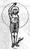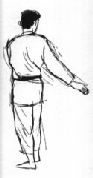 Debout les jambes légèrement écartées, bras le long du corps; faire pivoter le buste sans bouger les jambes, alternativement à droite, à gauche; les bras font le mouvement en balancier; le tronc et la tête suivent le mouvement; effectuer 4 à 5 fois puis prendre une respiration complète, retenir le souffle et après avoir fait l'exercice à droite et à gauche, on expire au moment où la rotation est vers l'arrière et en se servant des bras pour comprimer la poitrine en tapant sur elle. |