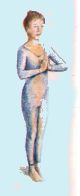 debout les pieds joints paumes des mains vers la poitrine comme pour la prière. |