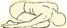 longtemps, c'est sans importance. Penchez-vous doucement en avant, en rejetant le souffle, jusqu'à ce que la tête touche le sol, le plus près possible des genoux. Posez les mains en arrière, le long du corps. Le corps se trouve plié en trois, les cuisses sur les .jambes, la poitrine sur les cuisses. C'est une posture de détente. |