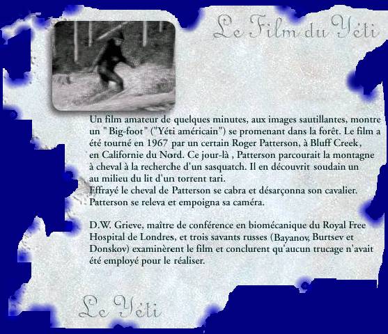 - des films super 8 ou vidéo, même si le fameux film de Roger Patterson (1967) fait penser à un homme vêtu d'une peau et affublé d'un passe-montagne plutôt qu'à un primate inconnu.