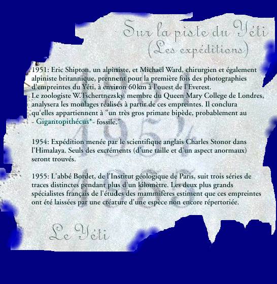 Voici son témoignage :"de larges traces de pas traversaient notre chemin et se dirigeaient vers les cimes; c'était la piste, m'affirma-t-on d'un de ces hommes sauvages et velus qui, selon la croyance, vivent au milieu des neiges éternelles en compagnie des lions blancs mythiques. |