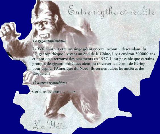 Peut-être un jour trouvera- t-on le yeti. Souvenons -nous qu'il n'y a pas si longtemps des espèces comme le panda de Chine ou le gorille d'Afrique passaient encore pour de simples légendes. |